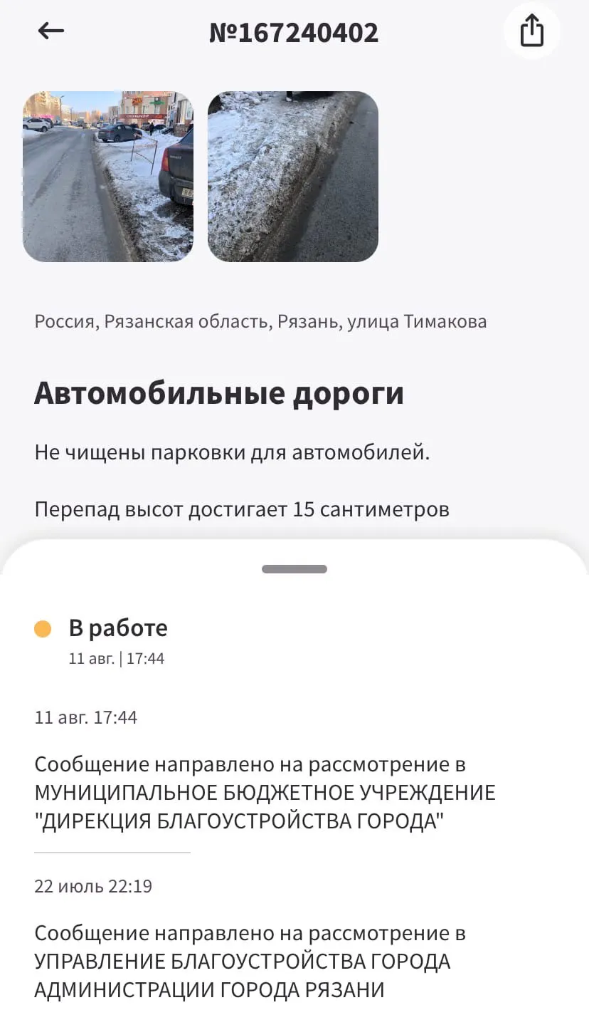 Историей рязанец поделился в соцсетях. Речь идет об улице Тимакова. 22 июля случилось чудо, и заявку передали на рассмотрение Управлению благоустройства города Рязани. На этом ее приключения не закончились. 11 августа заявку стали рассматривать в Дирекции благоустройства, статус обращения - "в работе". Зато, когда заявку наконец закроют, можно будет указать, что она выполнена на 100 процентов. Но если обращение доживет до следующей зимы, все начнется сначала...