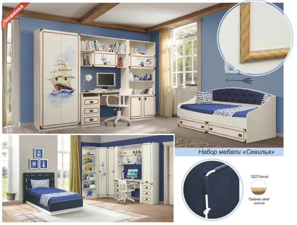 Детская для мальчика, оформленная со вкусом. Красивый дизайн в морском стиле может подойти как ребятам младшего возраста, так и подросткам. Яркие корабли, нарисованные на шкафах, могут заменить постеры и настенные картины. Больше информации по “Севильи” смотрите здесь.