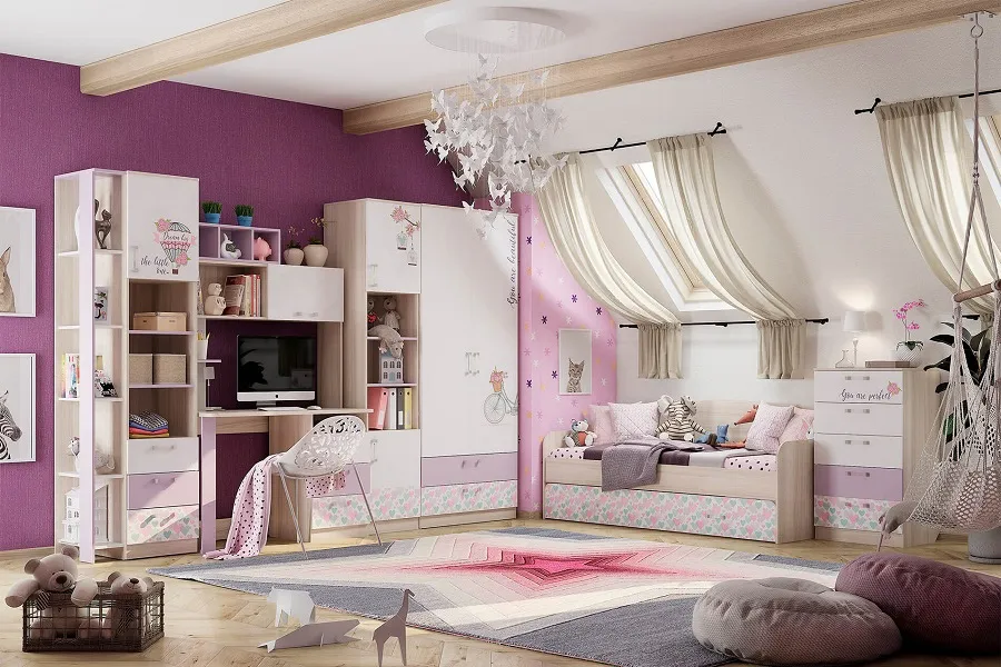 Такая комната понравится любой девочке. Коллекция выполнена в нежных белых и розовых тонах, декорирована цветочными принтами. Сочетание таких оттенков и рисунков создаст в комнате легкую атмосферу - то, что надо для мечтательной натуры! Больше про “Адель” можете почитать здесь.