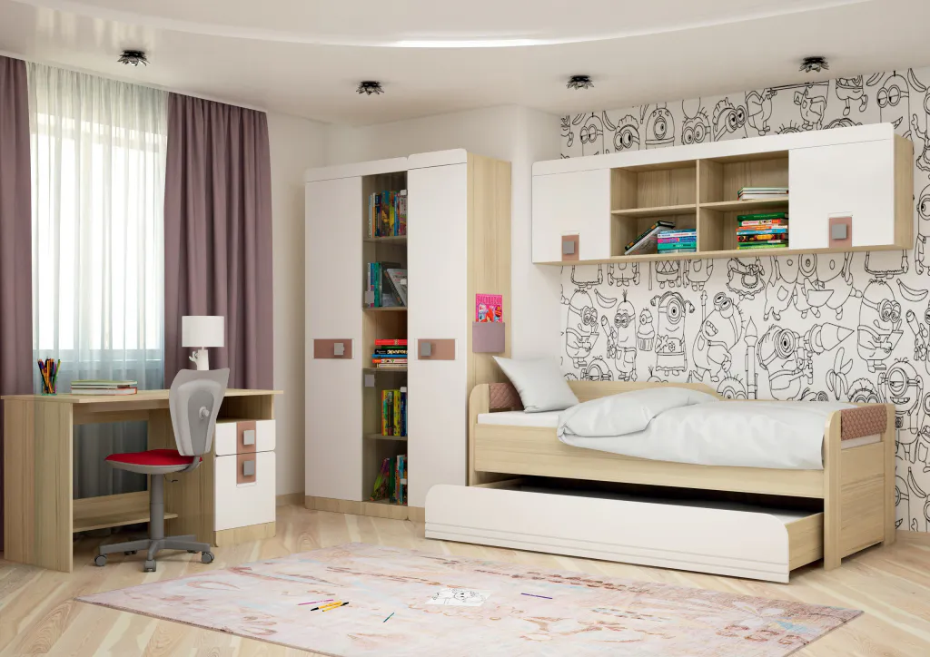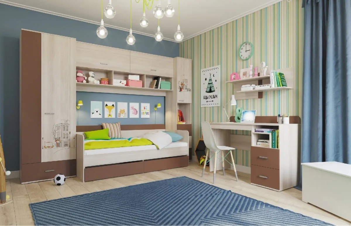Про этот комплект можно сказать три слова - мягко, уютно и тепло. Он состоит из шкафов, кроватей для одного или двух детей, письменного стола со встроенной тумбой, вместительных стеллажей и навесных полок для хранения книг и других нужных мелочей. Весь модульный ряд можно посмотреть здесь.