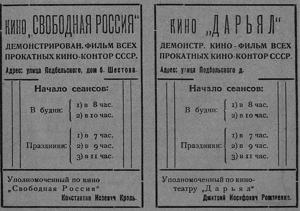 Афиши кинотеатров "Свободная Россия" и "Дарьялы"