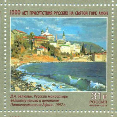 На ней изображена картина народного художника России Дмитрия Белюкина «Русский монастырь великомученика и целителя Пантелеимона на Афоне» (1997 год). Марка размером 50х50 миллиметров номиналом 31 рубль, изданная тиражом 228 тысяч экземпляров, поступит в продажу в отделения Почты России по всей стране.