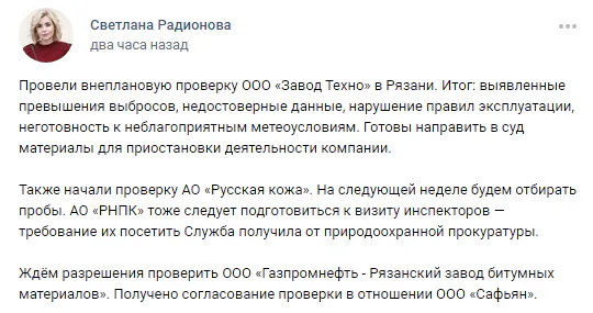 Глава Росприроднадзора дополнительно сообщила, что на очереди - рейд на нефтезавод и в компанию "Сафьян". А прямо сейчас идет проверка АО "Русская кожа". В дальнейшем специалисты планируют добиваться разрешения посетить Рязанский завод битумных материалов.