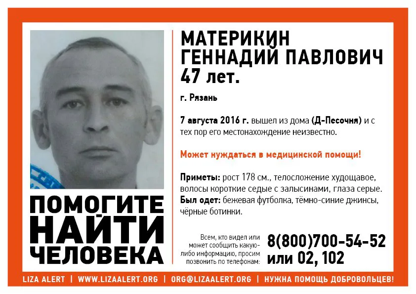 Материкин Геннадий Павлович 7 августа вышел из дома (район Дашково-Песочня) и с тех пор его местонахождение неизвестно.