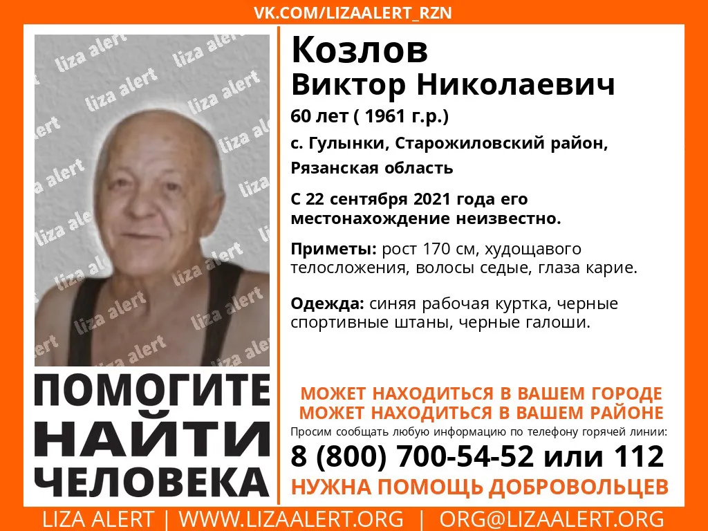 Волонтеры поисково-спасательного отряда "Лиза Алерт" объявили в розыск 60-летнего жителя села Гулынки Старожиловского района Виктора Козлова. Активисты ПСО добавили, что мужчина ушел из дома в неизвестном направлении 22 сентября.