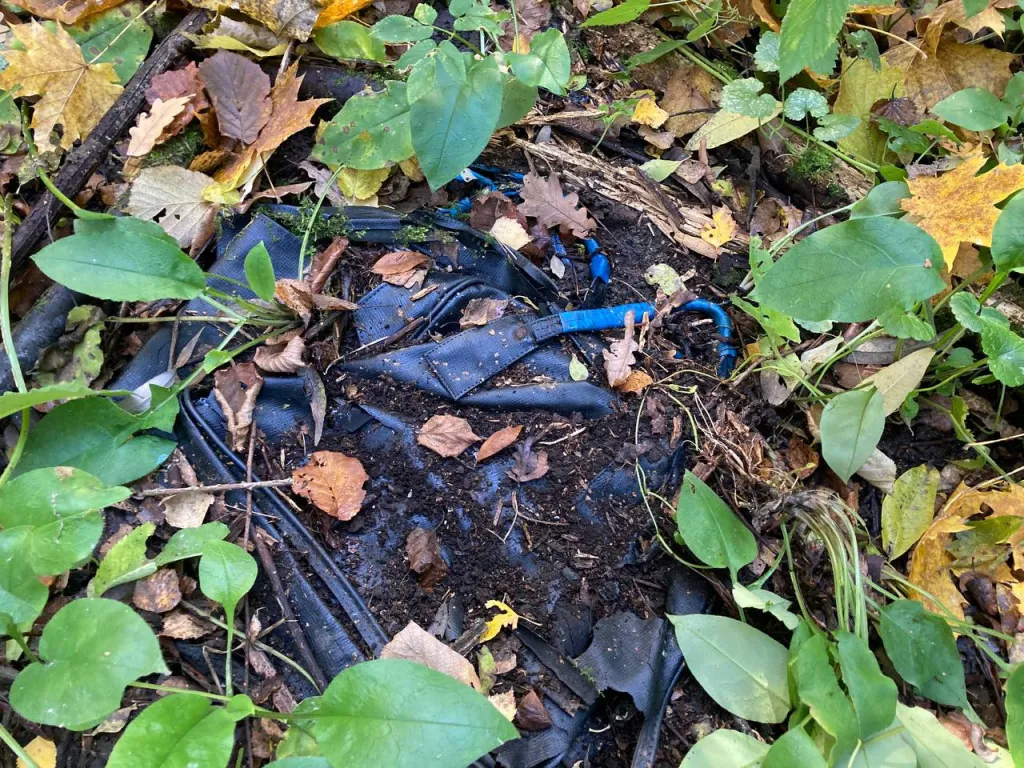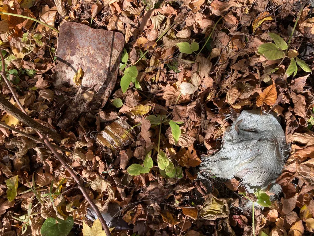 Лесополоса заканчивается возле частного сектора. Рядом – свалка одежды, бутылок, игрушек. Поисковики изучают свалку, ставят геоотметку. Находим проржавевшее лезвие лопаты, полузакопанный холщовый мешок. Фиксируем на камеру, записываем координаты, идем дальше.