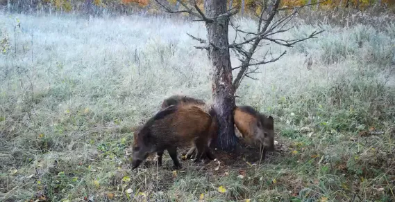 В Окском заповеднике кабанчики чешут спинку о дерево