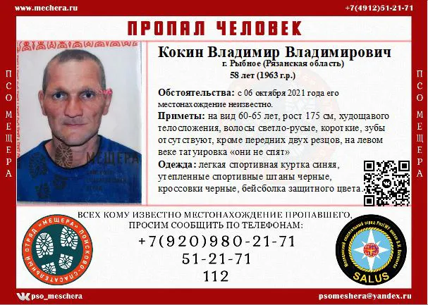 В Рыбном пропал 58-летний Владимир Кокин, - об этом на своей странице сообщили активисты ПСО «Мещёра». Сообщается, что местонахождение мужчины неизвестно с 6 октября.
