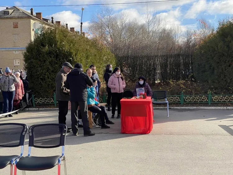 На площадь перед местным Домом культуры привезли закрытые гробы с телами Виктора Аникина, Елены Туляковой, Андрея Воеводина, Вячеслава Петрикова, Артема Шилова, Александра Курчакова, Александра Соловьева, Михаила Сычева, Игоря Расходчикова, Алексея Тебенькова, Алексея Минкова, Валерия Белокопытова, Андрея Милованова. Прощание с Маликом Папазяном прошло без гроба – его тело все еще находится на судмедэкспертизе.