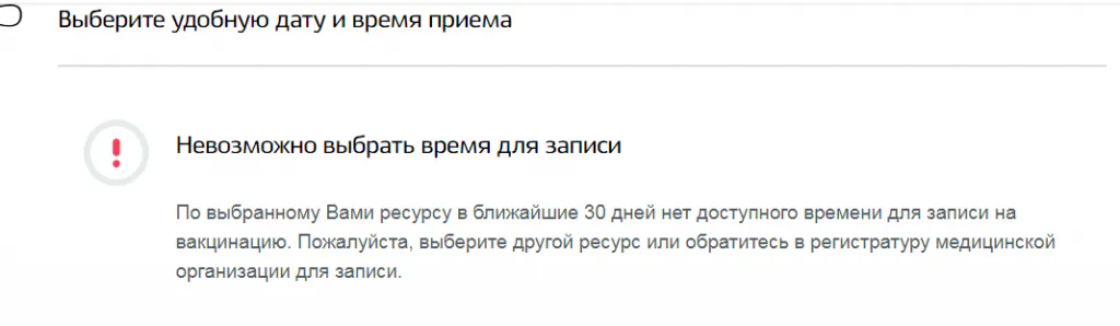 Запись недоступна в ближайшие 30 дней… Это значит, что за время локдауна вы не сможете получить свою вакцину, если вы не успели записаться ранее. Кстати, периодически, система выдает ошибку. Хотя эта ошибка вылезала и ранее.