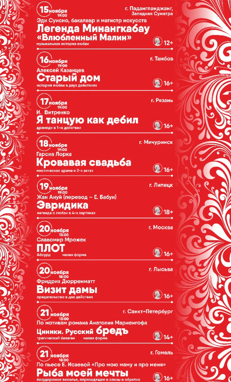 С 15 по 21 ноября на сцене Рязанского театра драмы свои лучшие спектакли покажут коллективы из разных городов России, а также Белоруссии и Индонезии. Вас ждут романтичные и страстные истории любви, притчи и фантасмагории, классические и современные постановки.Выбирайте спектакли по душе и приходите в праздничный театр!
