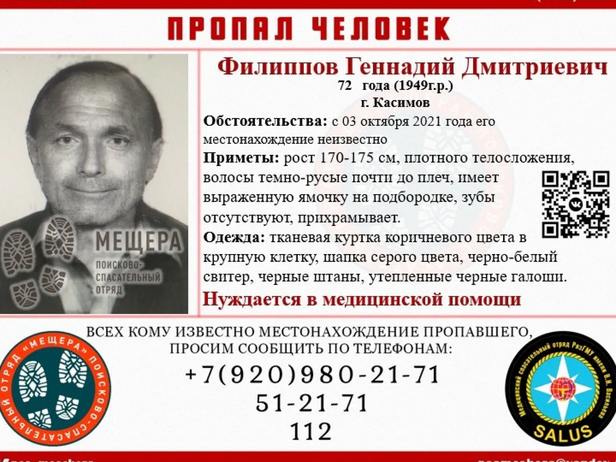 Если вы видели Геннадия Филиппова, или знаете, где он может находиться, сообщите по телефонам +7 (4912)51-21-71 (дежурный отряда), 112 (полиция).