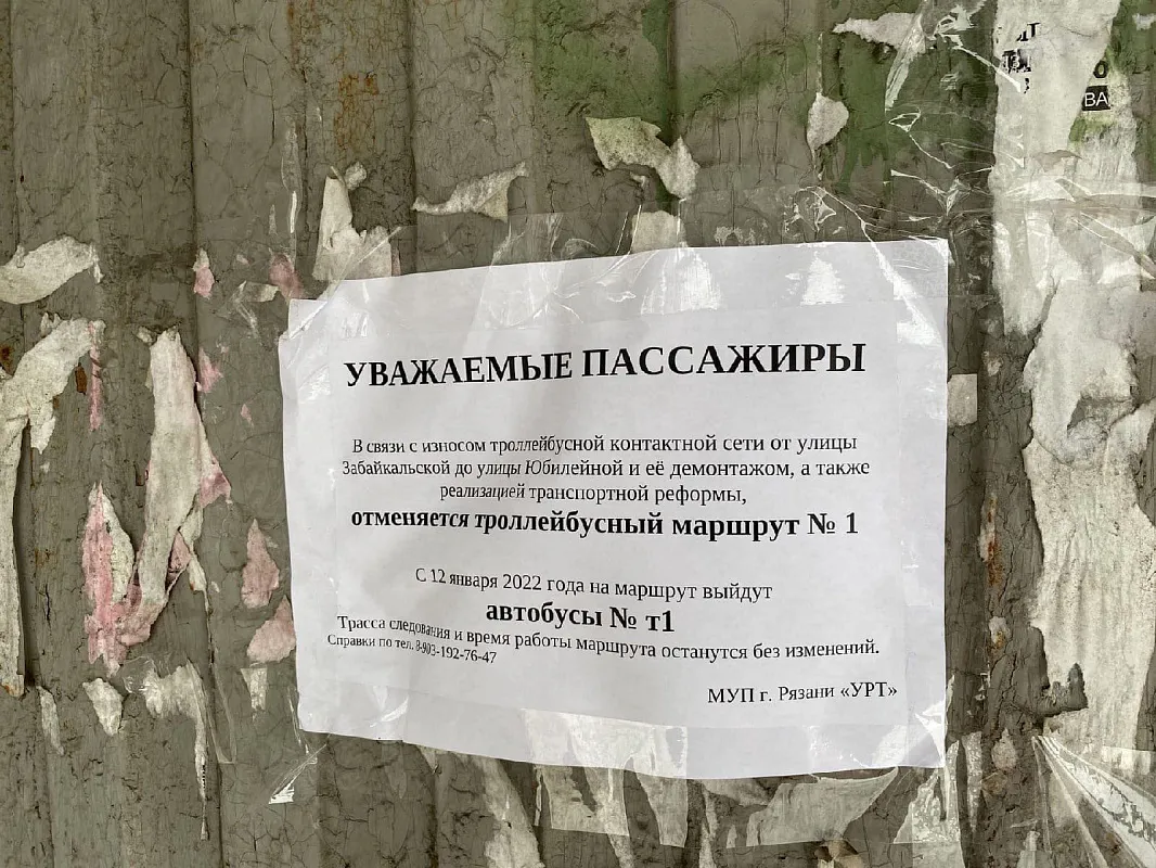 На рязанских остановках появились объявления, расклеенные неизвестными. В них говорится о том, что 12 января будет отменен троллейбусный маршрут №1. Причиной называется износ контактной сети и реализацией транспортной реформы. Сообщения появились на многих остановках города и на конечной маршрута №1.