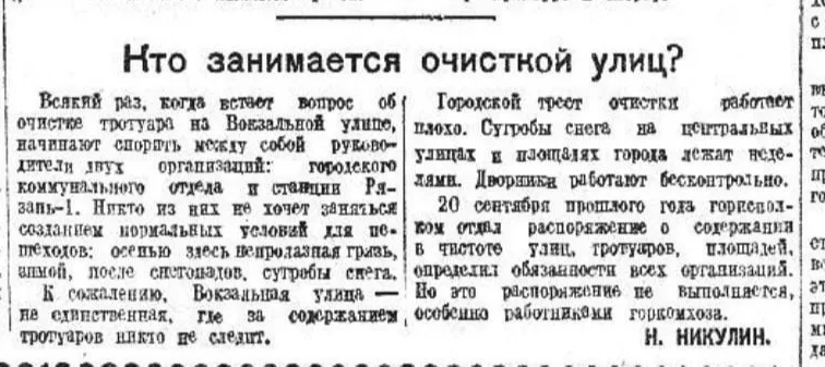 Каждый раз, когда встаёт вопрос об очистке тротуара на Вокзальной улице, начинают спорить между собой руководители двух организаций: городского коммунального отдела и станции Рязань-1. Никто из них не хочет заняться созданием нормальных условий для пешеходов: осенью здесь непролазная грязь, зимой, после снегопадов, сугробы снега, – заключил автор статьи.
