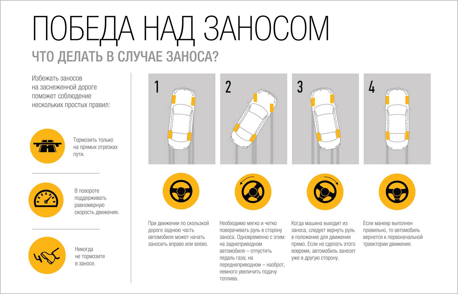 Зимой, это один из важнейших навыков, который может пригодится в любой момент вашей поездки. Занос возникает, если автомобиль попадет на поверхность с малым сцеплением, например на обочину.