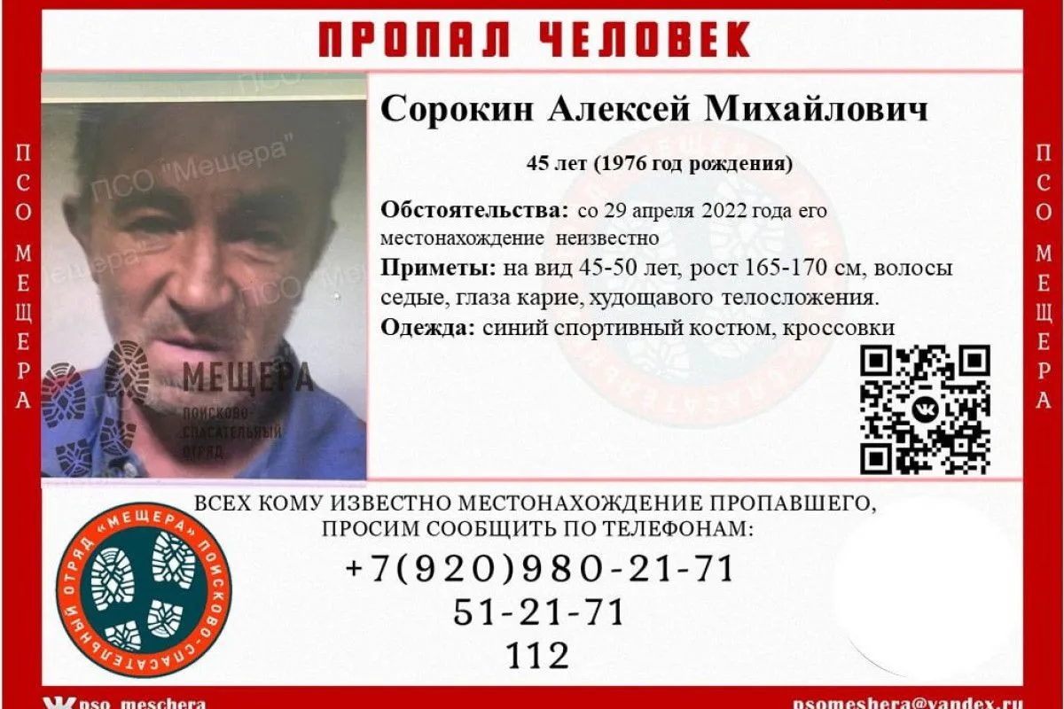 По данным волонтёров, о местонахождении 45-летнего Алексея Сорокина ничего не известно с прошлой пятницы, 29 апреля 2022 года.