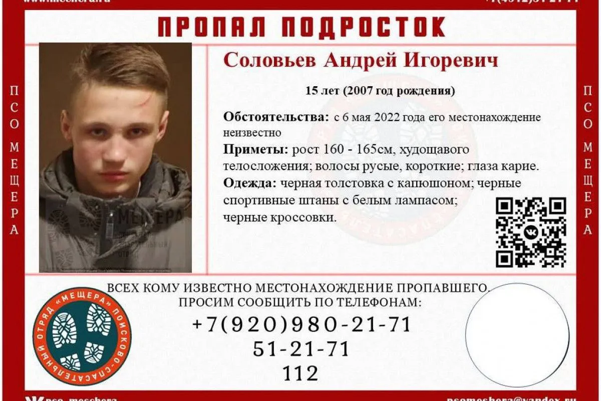 По данным поисково-cпасательного отряда “Мещера” в Рязанской области и её округе разыскивается 15-летний мальчик Андрей Соловьёв. По информации волонтеров и активистов юноша пропал из Рыбного 6 мая 2022 года.