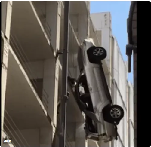 В США автомобиль вылетел с девятого этажа парковки и повис на проводах. Об этом сообщает Life.