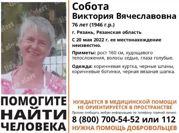 В Рязанской области идут поиски 76-летней жительницы города Рязани Виктории Соботы. Пост с ориентировкой появился в областном паблике Вконтакте поискового отряда "Лиза Алерт".