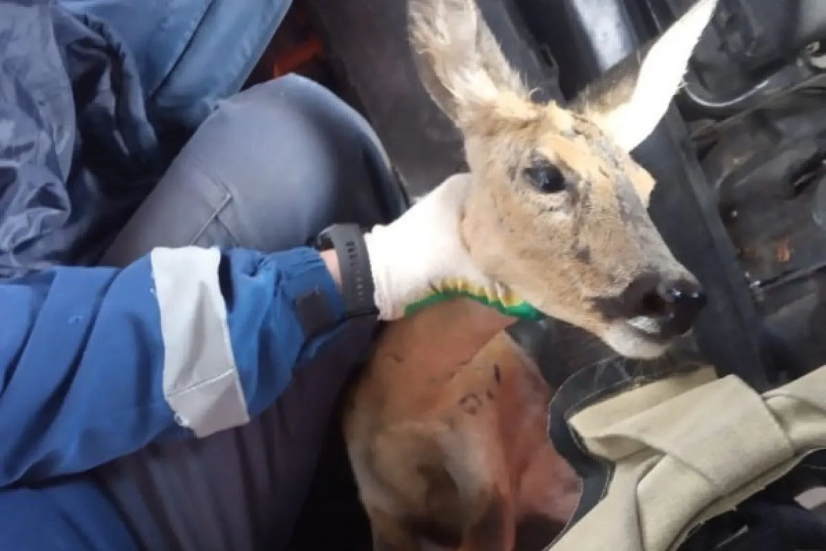 На место оперативно прибыли работники аварийно-спасательной службы Рязани. Двое мужчин сумели схватить зверя, несмотря на то, что косуля не понимала, что ей пытаются помочь и при любом удобном случае старалась сбежать.