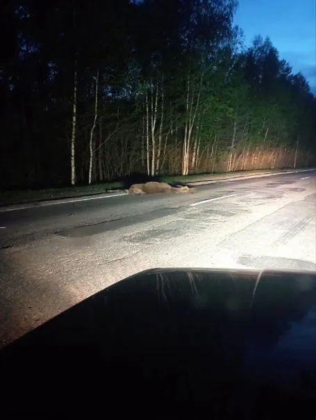 На снимке видно лося, лежащего на обочине. Стоит отметить, что инцидент произошел в достаточно темное время суток. В комментариях люди высказали свою позицию по поводу аварии.
