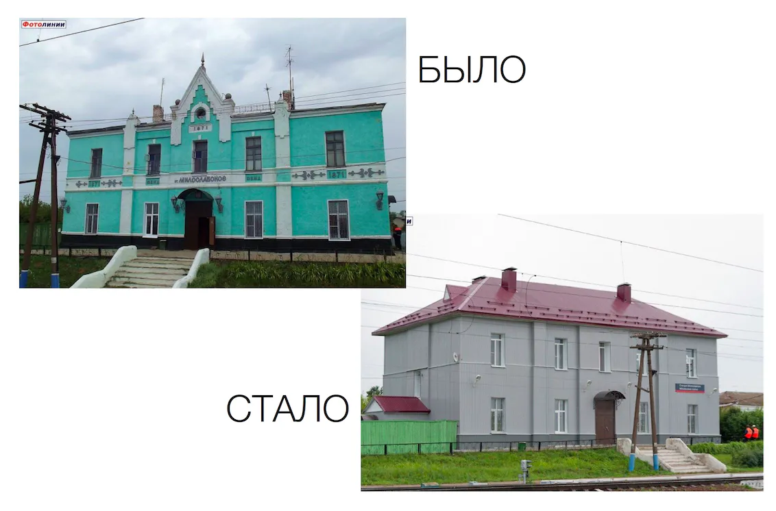Российский блогер Артемий Лебедев на своей странице в facebook опубликовал фотографии железнодорожной станции Милославское. Артемий сравнивает станцию до и после ремонта: из красивого здания с множеством деталей станция превратилась в серую коробку. Пользователи социальной сети разделяют негодование Артемия.