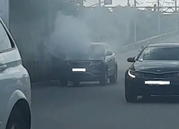 На ролике видно, что машина стоит без движения с приоткрытой дверью со стороны пассажирского сиденья. Из машины валит густой белый дым. Рядом с машиной стоит машина сотрудников ГИБДД. Движение на участке дороги из-за происшествия затруднено не было. Автомобилисты спокойно проезжают мимо ЧП.