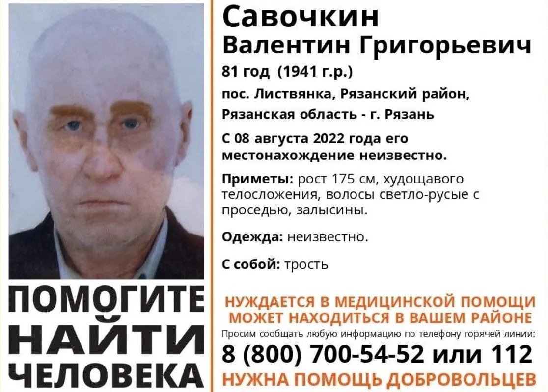 В Рязанском районе ищут пропавшего 81-летнего Валентина Савочкина. Мужчина пропал 8 августа в поселке Листвянка и с тех пор данных о его местоположении нет. Добровольцы поисково-спасательный отряд «ЛизаАлерт» опубликовали в социальных сетях ориентировку.