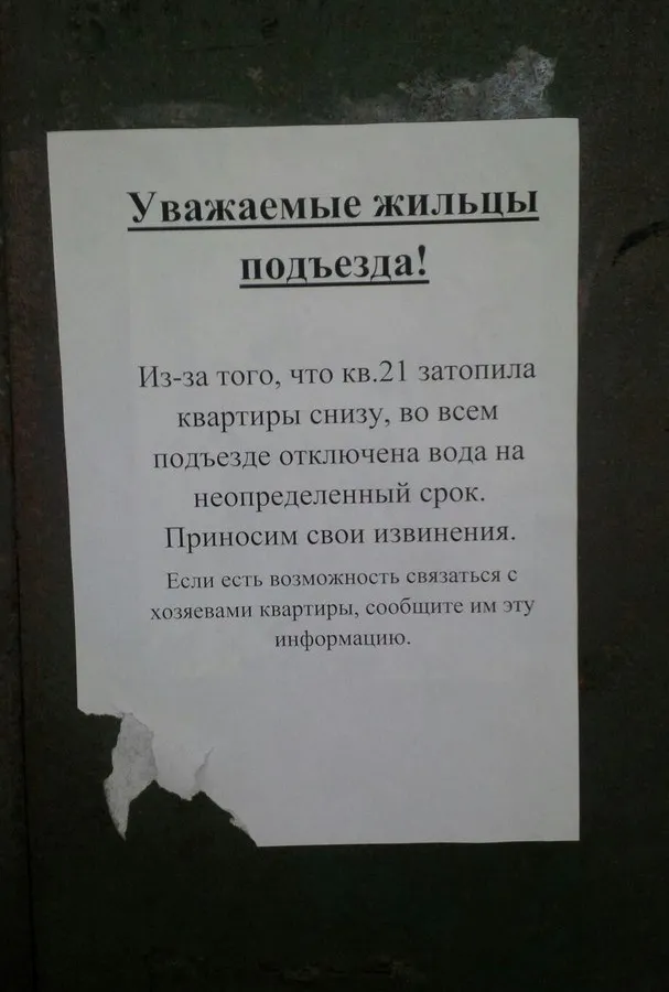 - В квартире уже долгое время никто не живет. Нам пришлось отключить воду во всем подъезде, чтобы остановить потоп. К несчастью,  включить воду пока они не появятся мы не можем. Что теперь делать непонятно, - взволнованно рассказывает Ирина Фокс, жительница дома.