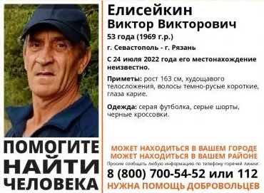 В Рязанской области просят помочь в розыске пропавшего 53-летнего Елисейкина Виктора. Он пропал еще 24 июля 2022 года, и с тех пор данных о его местонахождении нет. Он может быть в Рязани или на территории региона.