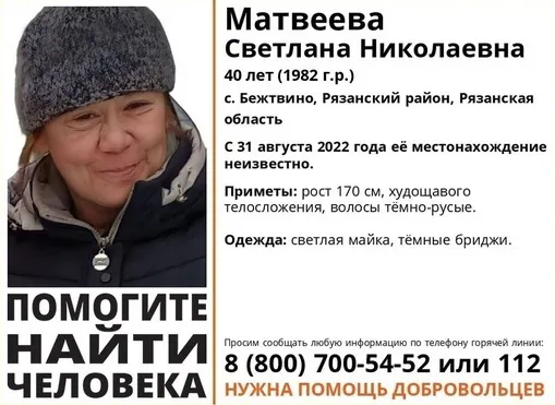 Добровольцы опубликовали ориентировку с приметами пропавшей рязанки: рост 170 сантиметров, телосложение худощавое, тёмно-русые волосы. Одета разыскиваемая была в светлую майку и тёмные бриджи.