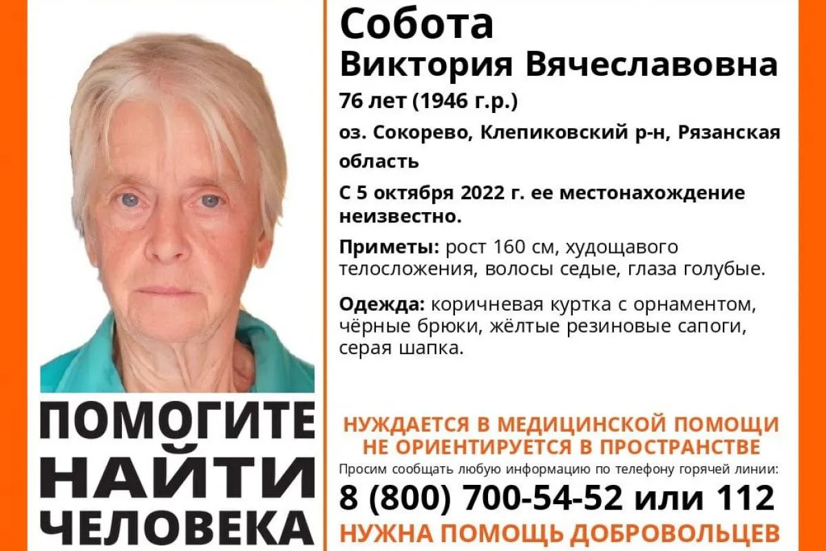 Виктория Собота разыскивается полицией и добровольцами. Названы приметы пропавшей: рост 160 сантиметров, худощавое телосложение, седые волосы и голубые глаза.