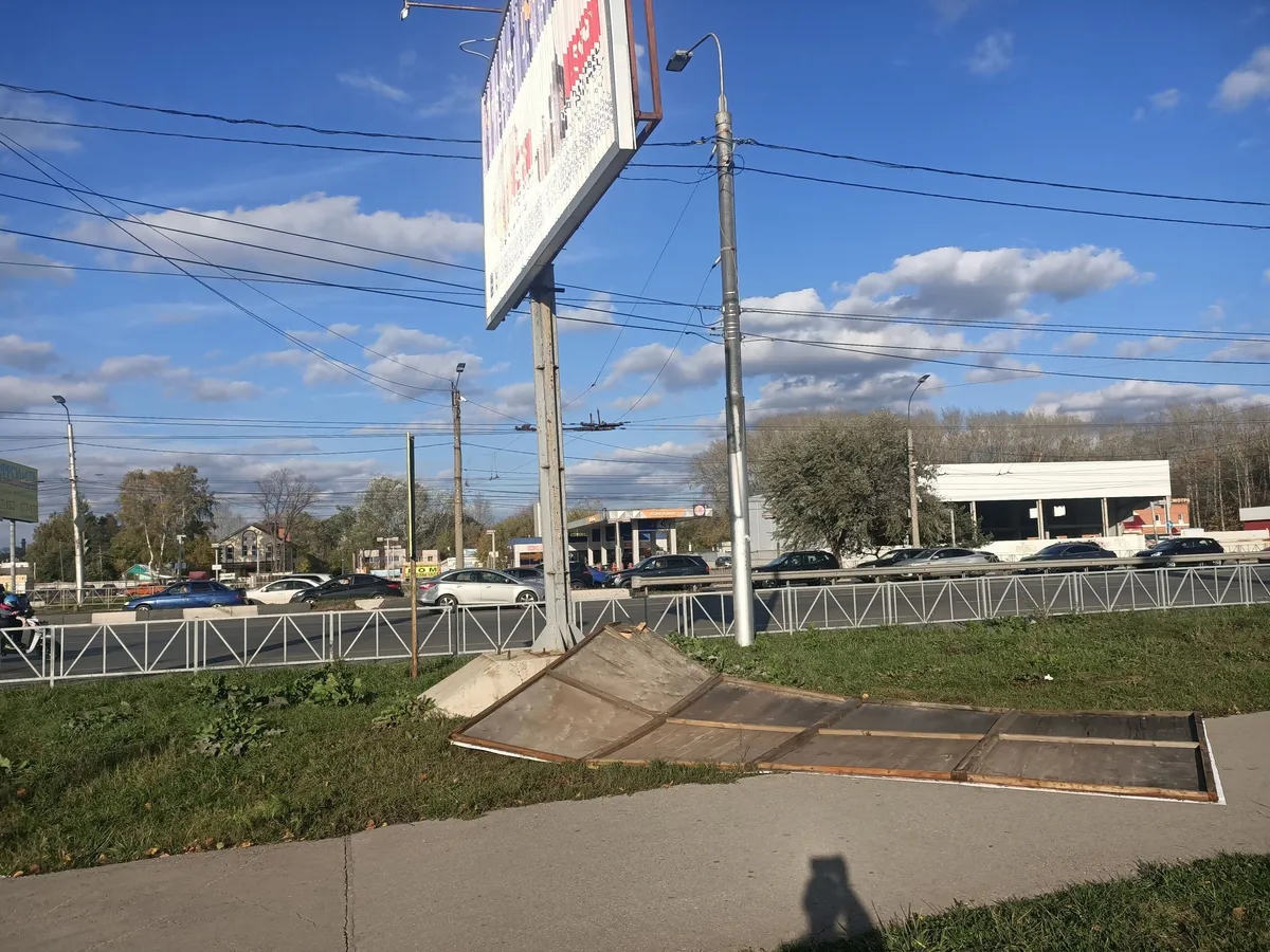 Часть рекламной конструкции отвалилась на Московском шоссе в воскресенье, 9 октября. По счастливой случайности никто из жителей Рязани не пострадал.