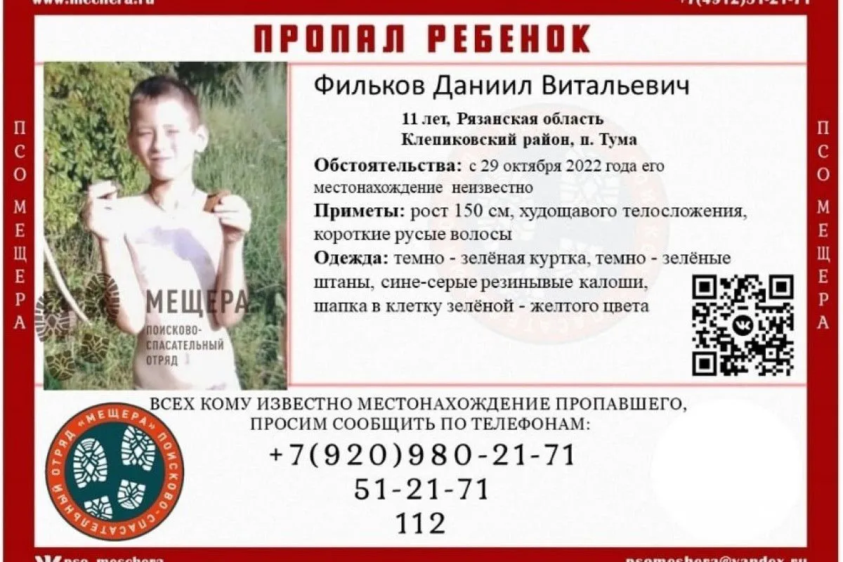 Стало известно о том, что в поселке Тума Клепиковского района Рязанской области пропал 11-летний Даниил Витальевич Фильков. О местонахождении мальчика ничего не известно с субботы, 29 октября 2022 года. Об этом сообщили в сообществе поисково-спасательного отряда «Мещера».