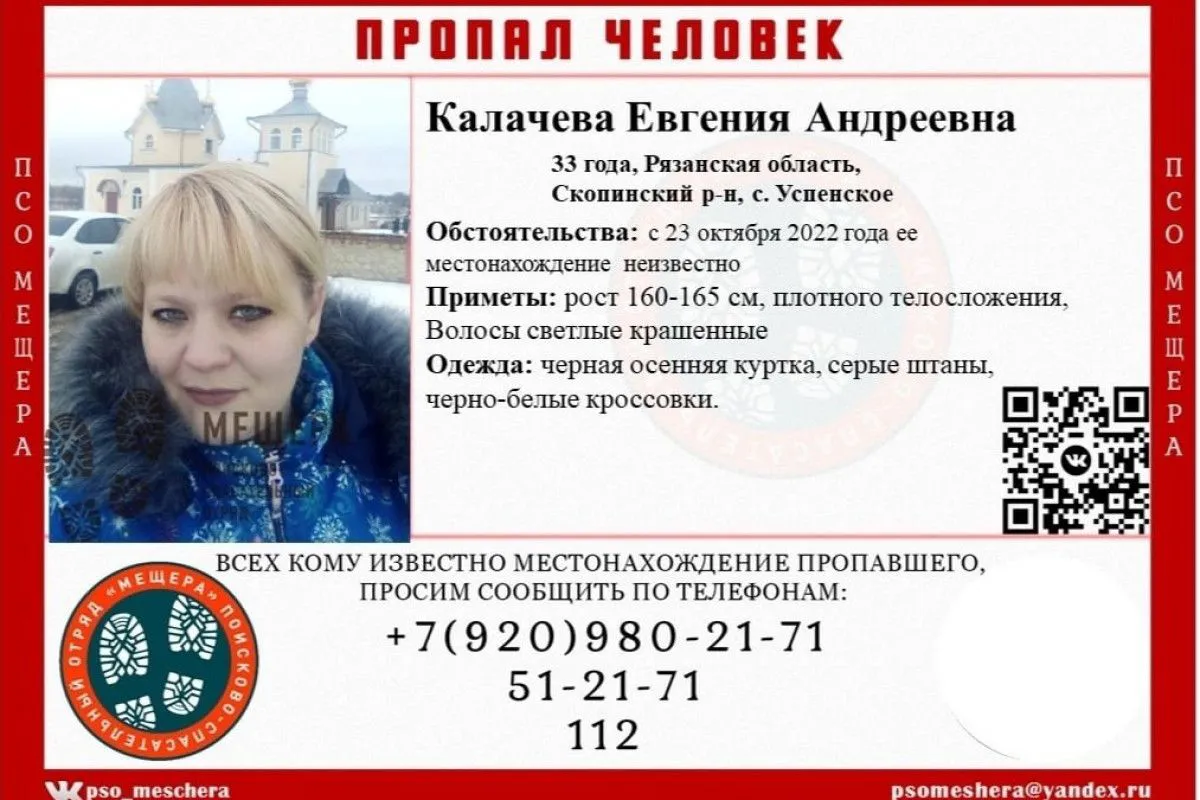 Стало известно о том, что в Скопинском районе Рязанской области разыскивают 33-летнюю Евгению Калачеву. Подробности рассказали волонтеры поисково-спасательного отряда «Мещера». По данным ПСО, женщина пропала в населенном пункте Успенское. О ее местонахождении нет никаких данных с 23 октября.