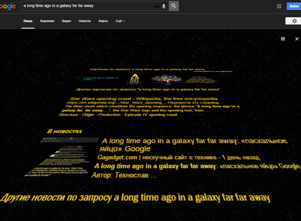 В связи с этим компания Google приготовила сюрприз для фанатов франшизы. Секрет находится в поисковой системе. Чтобы его активизировать, нужно ввести в строку знаменитую фразу на английском «A long time ago in a galaxy far far away». После этого страница изменит свой вид: фон станет черными появятся уплывающие желтые титры в стиле «Звездных войн».