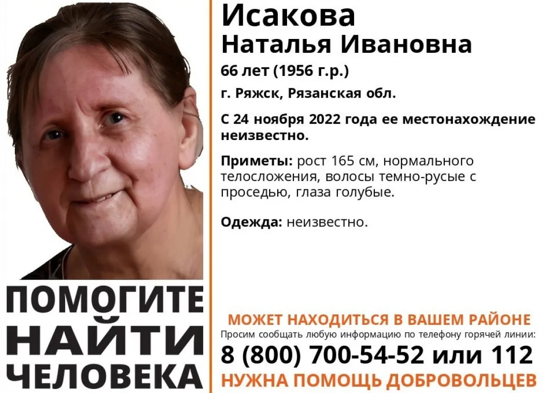 Жителей Рязанской области просят помочь в розыске 66-летней Натальи Исаковой. 66-летняя горожанка пропала в Ряжске 24 ноября. С тех пор информации о ее местонахождении не поступало. Об этом рассказали добровольцы поисково-спасательного отряда «Лиза Алерт».