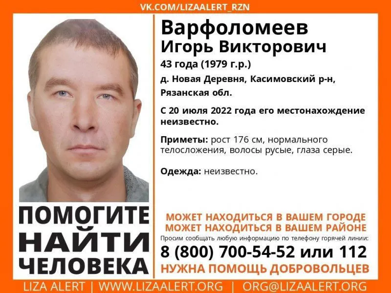 Известно, что пропавший Игорь Варфоломеев проживал в населенном пункте Новая Деревня Касимовского района. О его местонахождении ничего не известно с 20 июля 2022 года. Согласно ориентировке, рост мужчины составляет 176 сантиметров, телосложение нормальное, волосы русые, глаза серого оттенка. Одежда неизвестна. Всех, кто обладает какими-либо данными о местонахождении пропавшего, убедительно просят позвонить по номерам 112 или 8 (800)700-54-52.