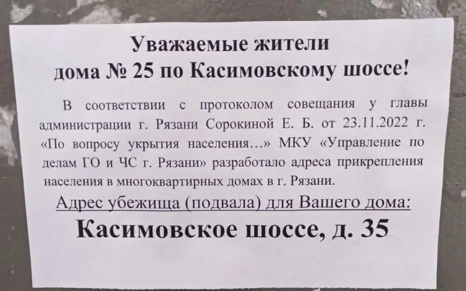 Согласно информации объявления, после публикации результатов протокола от 23 ноября 2022 года МКУ «Управление по делам ГО и ЧС Рязани» разработала адреса прикрепления населения в многоквартирных домах в городе. Известно, что совещание проходило у руководителя администрации города Елены Сорокиной. Подлинность объявлений уточняется в пресс-службе мэрии.