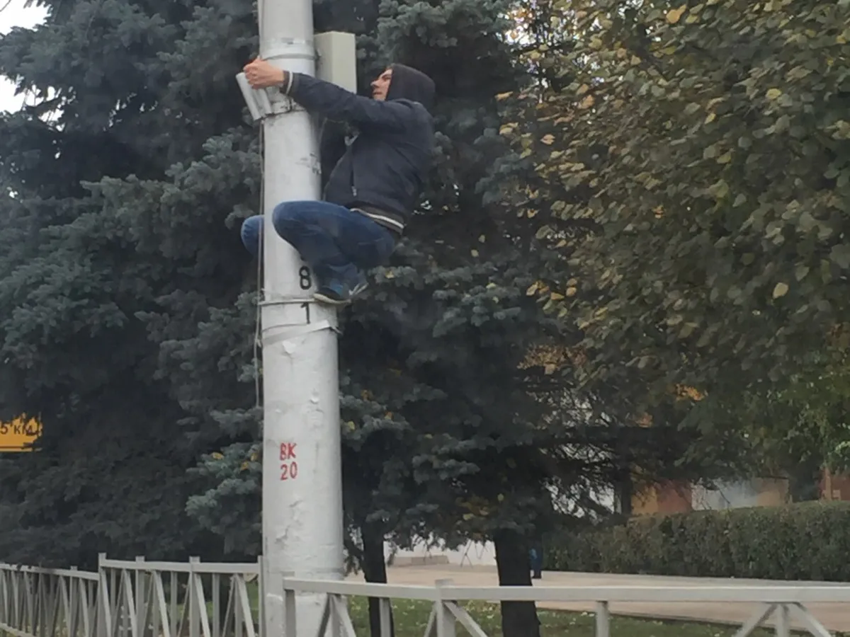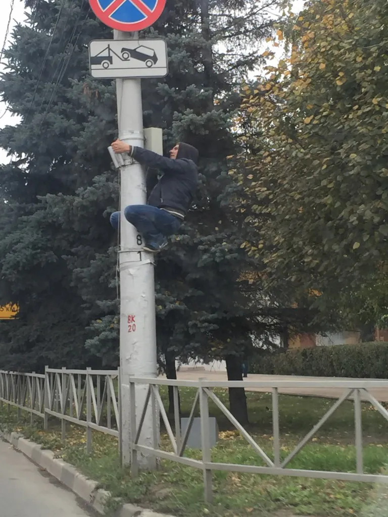 В центре Рязани прохожий залез на столб и что-то искал на нем