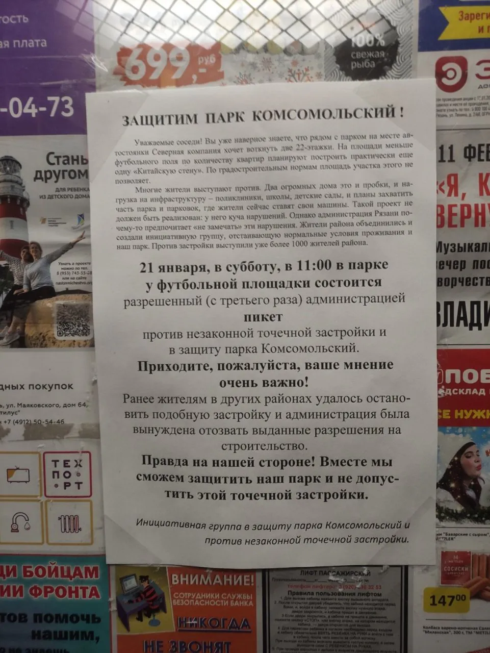 Рязанские активисты 21 января, в 11:00 организуют пикет у футбольной площадки со стороны дома № 6 по улице Новаторов в защиту Комсомольского парка. Соответствующие объявления появились в лифтах и на стенах жителей окрестных домов.