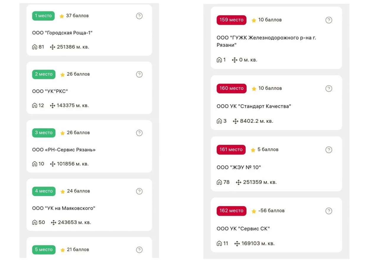 Всего в рейтинге перечислены 162 компании. На самом последнем месте с оценкой в -56 баллов расположено ООО УК «Сервис СК», на 161 – ООО «ЖЭУ №10» С оценкой в 5 баллов, замыкают тройку аутсайдеров ООО УК «Стандарт качества» и ООО «ГУЖК Железнодорожного района города Рязани» с 10 баллами. Лидируют в рейтинге ООО «Городская Роща-1», ООО «УК»РКС», ООО «РН-Сервис Рязань», и ООО «УК на Маяковского». У этих управляющих компаний 37, 26, 26 и 24 балла соответственно. Жители Рязани задаются вопросом, сдержит ли губернатор Рязанской области Павел Малков слово и уберет ли с рынка не справляющиеся со своими обязанностями управляющей компании?