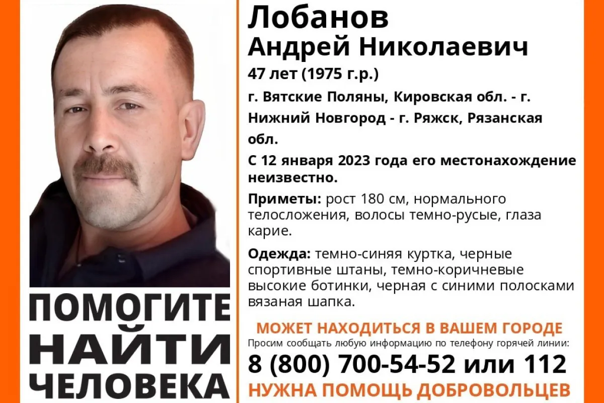 Согласно данным волонтеров, местонахождение Андрея Лобанова неизвестно с 12 января 2023 года. Предполагается, что он может находиться в городе Ряжске. Рост мужчины составляет 180 сантиметров, телосложение нормальное, волосы темно-русые, глаза карие. В день исчезновения на нём была темно-синяя куртка, черные спортивные штаны, коричневые высокие ботинки и черная с синими полосками вязаная шапка. Информацию о пропавшем просят сообщать по телефонам: 8-800-700-54-52 или 112.