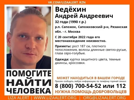 32-летний житель Сапожковского района имеет плотное телосложение, рост 187 сантиметров, длинные светлые волосы, серо-голубые глаза. В последний раз был одет в куртку защитного цвета, тёмные джинсы и кроссовки. Информацию о мужчине просят сообщать по телефону: 8(800)700-54-52.
