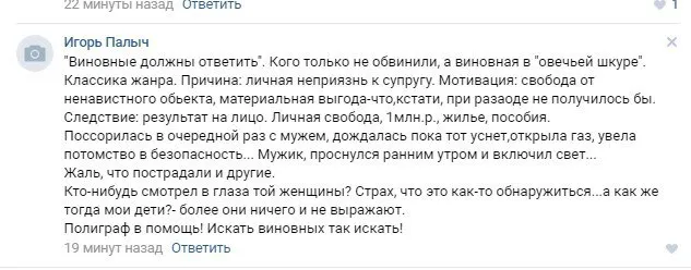 Кроме того, в комментариях социальных сетей появились активные пользователи, которых обычно называют "троллями" - они активно обвиняют несчастную семью и строят бредовые теории. Некоторые пошли так далеко, что предположили преднамеренное убийство. Мол, женщина, которая ушла накануне вечером из дома вместе с детьми, спланировала убийство мужа и сама открыла газ. При этом соседи характеризуют жильцов из квартиры №54 как адекватных и положительных людей. Если говорить об информационных технологиях - то именно так готовится почва для изменения общественного мнения.