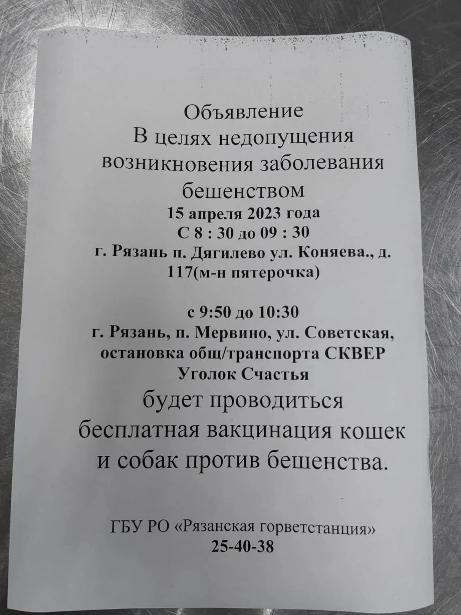 Стало известно, что в субботу, 15 апреля, в Рязани проведут бесплатную вакцинацию кошек и собак от бешенства. Об очередной волне вакцинации рассказали в социальных сетях в сообществе муниципальной Службы по контролю за безнадзорными животными, опубликовав соответствующее объявление.