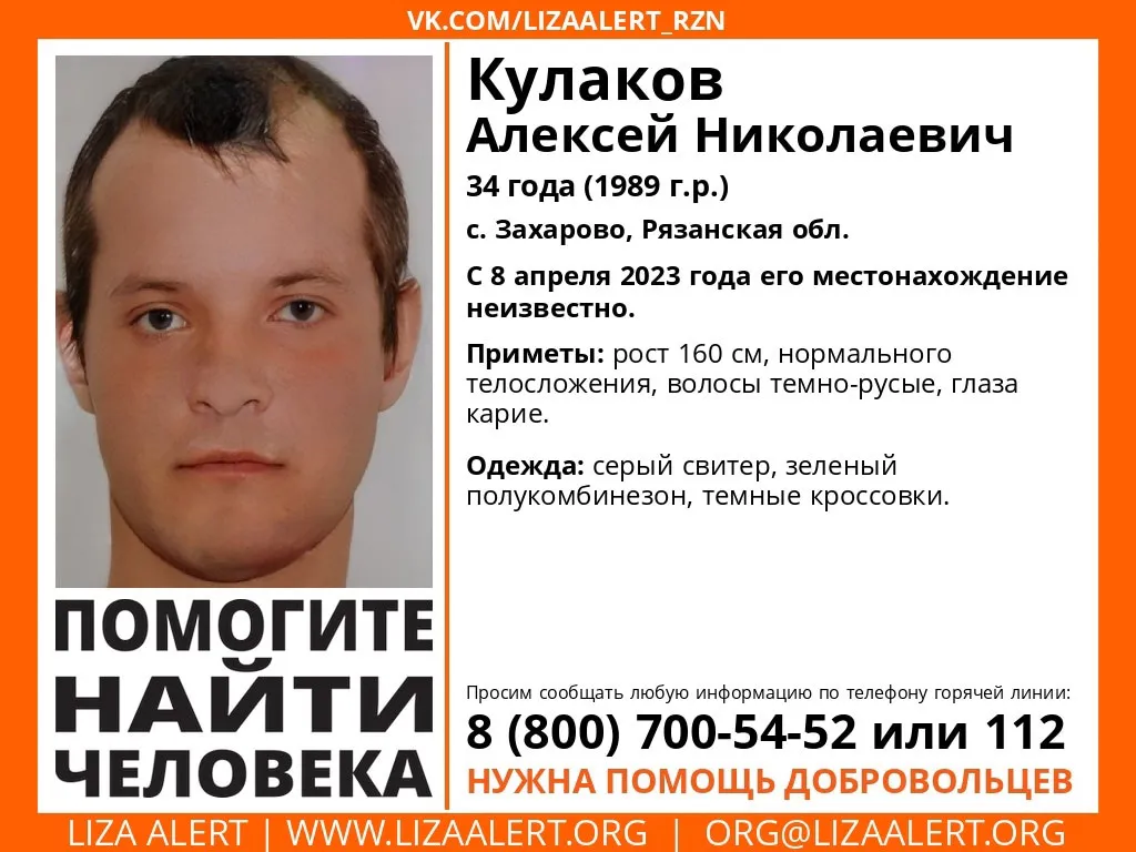 Мужчина проживал в селе Захарово Рязанской области. С 8 апреля 2023 года местонахождение 34-летнего мужчины неизвестно. Особые приметы Алексея Куликова: рост 160 см, нормального телосложения, темно-русые волосы, карие глаза. В тот день был одет в серый свитер, зеленый полукомбинезон и темные кроссовки.Любую информацию о пропавшем просят сообщать по телефонам: 8 (800) 700-54-52 или 112. Сообщается, что также для поисков необходима помощь всех желающих добровольцев.