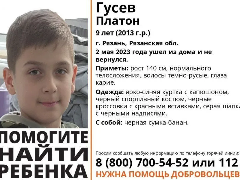 Сообщается, что Платон Гусев ушел из дома накануне, 2 мая 2023 года, и с тех пор не возвращался. Его рост составляет 140 сантиметров, телосложение нормальное, волосы темно-русые, глаза карие. В день исчезновения был одет ярко-синюю куртку с капюшоном, черный спортивный костюм, черные кроссовки с красными вставками и серую шапку. Всех, кому что-либо известно о местонахождении Платона, убедительно просят сообщить об этом по телефону: +7 (920) 632-62-79 или +7 (920) 632-62-19.