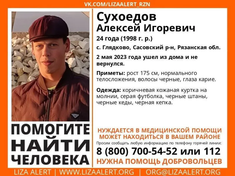На территории Рязанской области разыскивают 24-летнего молодого человека. Алексей Сухоедов в минувший вторник, 2 мая 2023 года, ушел из дома в населенном пункте Глядково Сасовского района и с тез пор не возвращался. Ориентировка была опубликована в пресс-службе поисково-спасательного отряда «Лиза Алерт».