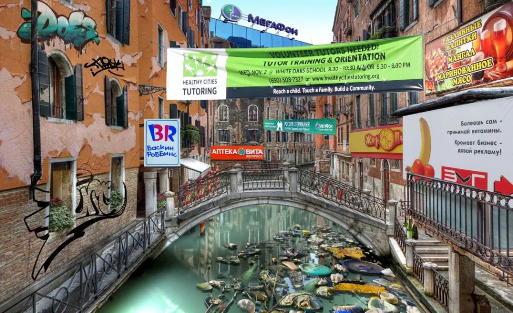 «Падкие на рекламу туристы ещё едут в Венецию, поэтому нужно использовать ресурс города, пока он окончательно не утонул. В нём строится сеть торговых центров, где гости города могут прятаться от запаха тлена вековых домов. Проныры (например, американский режиссёр Вуди Аллен), скупают квартиры в аварийном фонде в надежде, что после сноса их построек они получат новое жильё на материке. Жители города предпочитают бросать мусор прямо в каналы. Всё равно через каких-то сто лет всё это смоет водичка вместе с устаревшей Венецией»